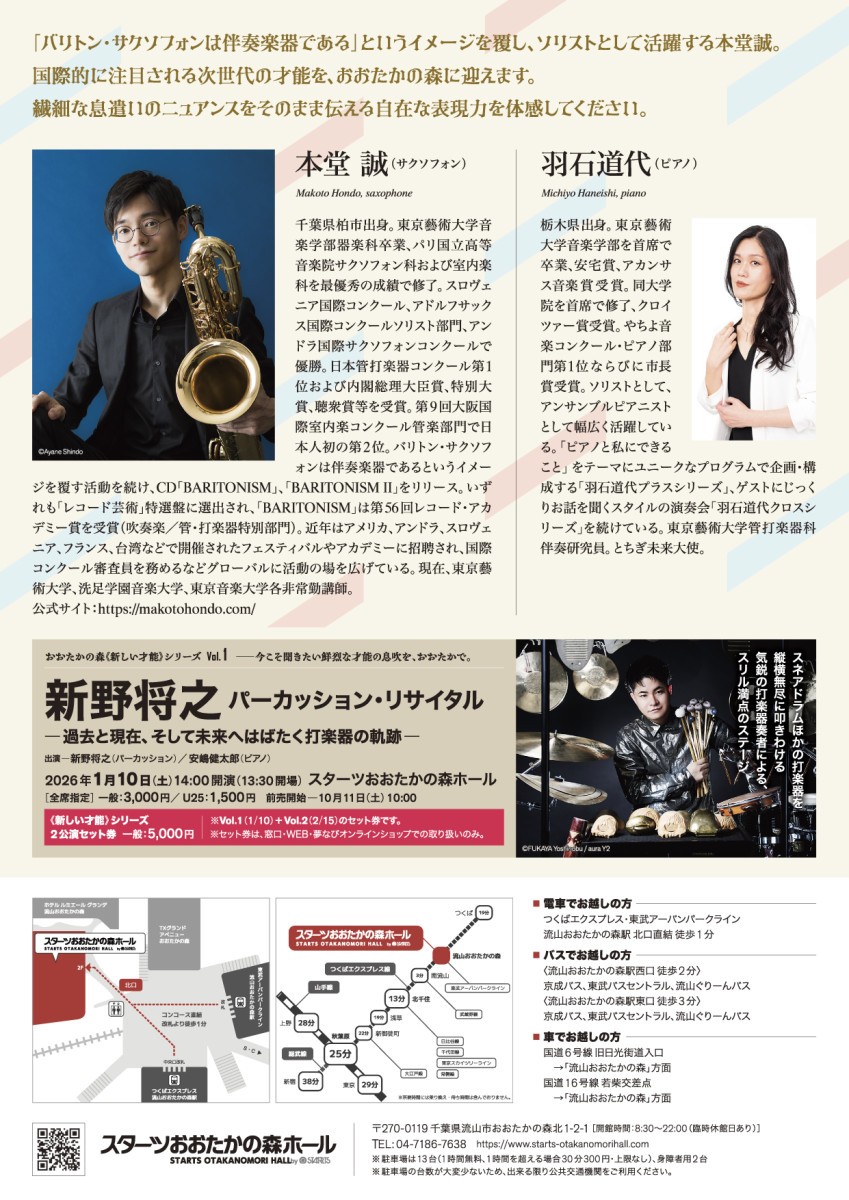おおたかの森《新しい才能》シリーズ Vol.2 スロヴェニア国際コンクール、アドルフサックス国際コンクールソリスト部門、 アンドラ国際サクソフォンコンクールで優勝し、国際的にも注目される本堂誠。 繊細な息遣いのニュアンスをそのまま伝える自在な表現力を体感してください。 【日時】 2026年2月15日(日)14:00開演(13:30開場) 【会場】 スターツおおたかの森ホール(千葉県流山市) 【出演】 本堂 誠 (サクソフォン) 羽石 道代(ピアノ) 【プログラム】 ~フランス音楽で聴くサクソフォンの魅力~ C. ドビュッシー:ラプソディ - アルト・サクソフォンとピアノのための B. マントヴァーニ:「霧雨の白熱」 M. ラヴェル:「亡き王女のためのパヴァーヌ」 V. ダヴィッド:Éclats d’échos(残響の破片) ~バリトン・サクソフォンの世界~ J. S. バッハ:無伴奏チェロ組曲第1番ト長調 BWV 1007 より E. グリーグ:チェロ・ソナタ イ短調 Op. 36 *曲目・曲順は変更になる場合があります。 【チケット】 一般:¥3,000 U25:¥1,500(開催当日に25歳以下の方) 【お問い合わせ】 スターツおおたかの森ホール TEL:04-7186-7638 https://starts-otakanomorihall.com/event/hall260215/![]()
