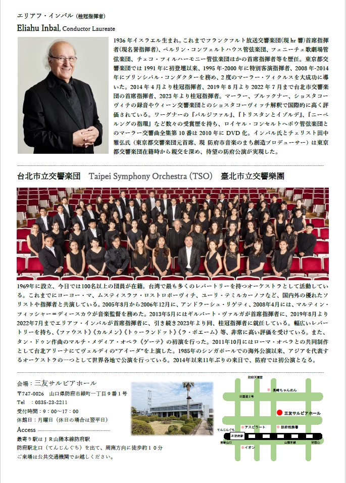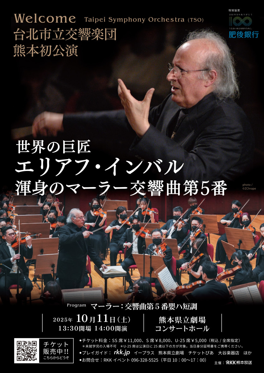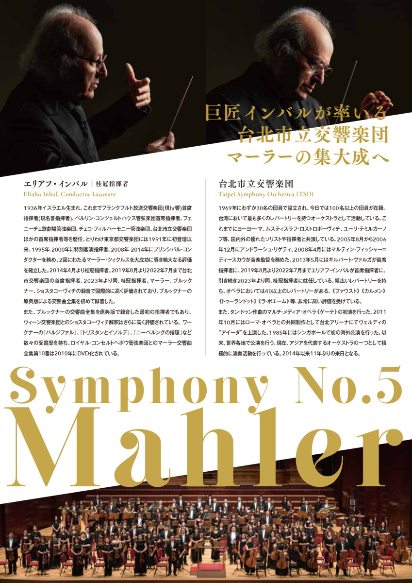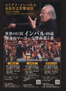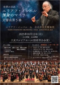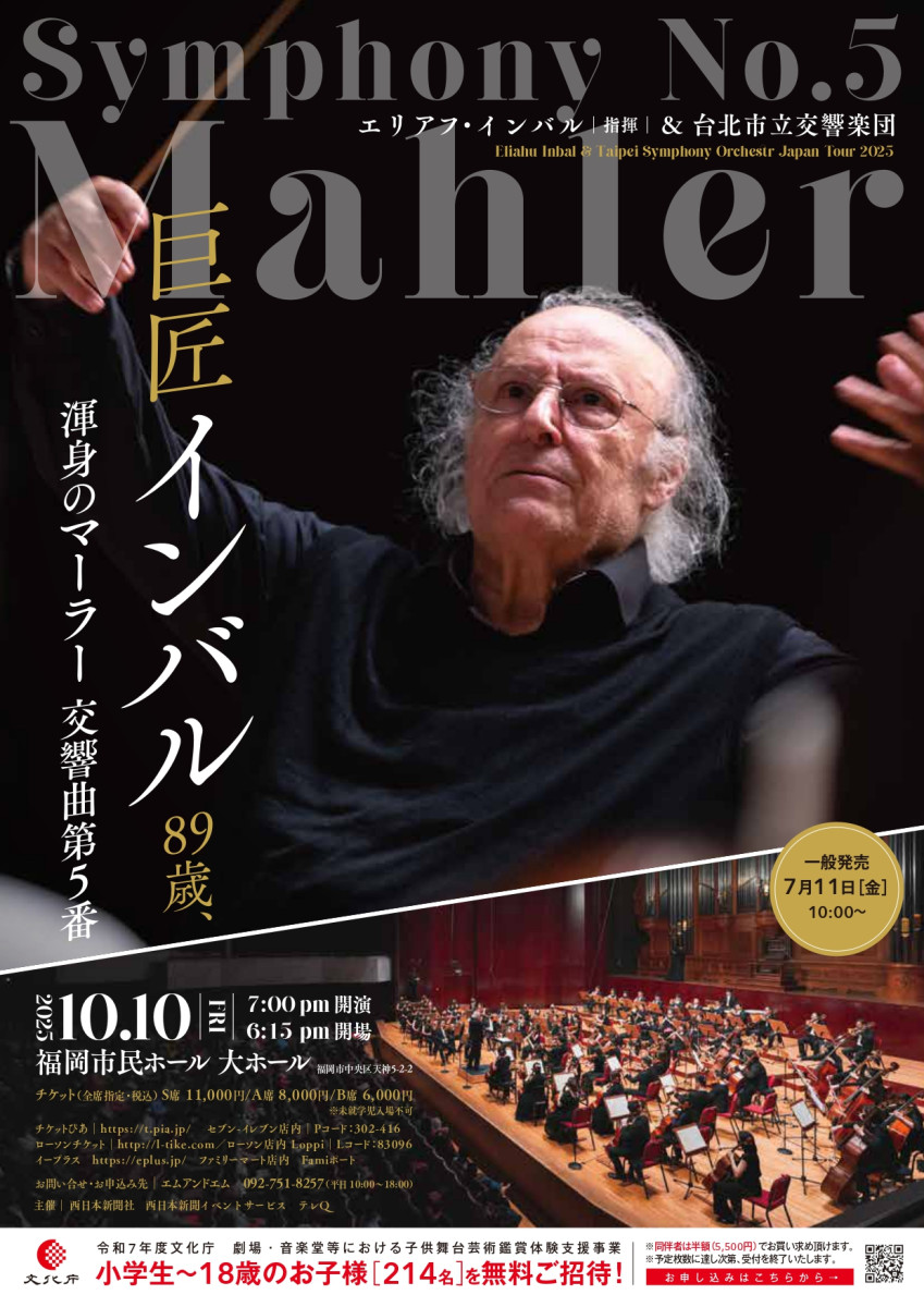 世界の巨匠エリアフ・インバル 渾身のマーラー交響曲第5番嬰ハ短調 台北から熱き音楽の風が福岡、熊本、防府へ! 【日時】 1.2025年10月10日(金) 19:00開演 (18:15開場) 2.2025年10月11日 (土) 14:00開演 (13:30開場) 3.2025年10月12日 (日) 16:00開演 (15:15開場) 【会場】