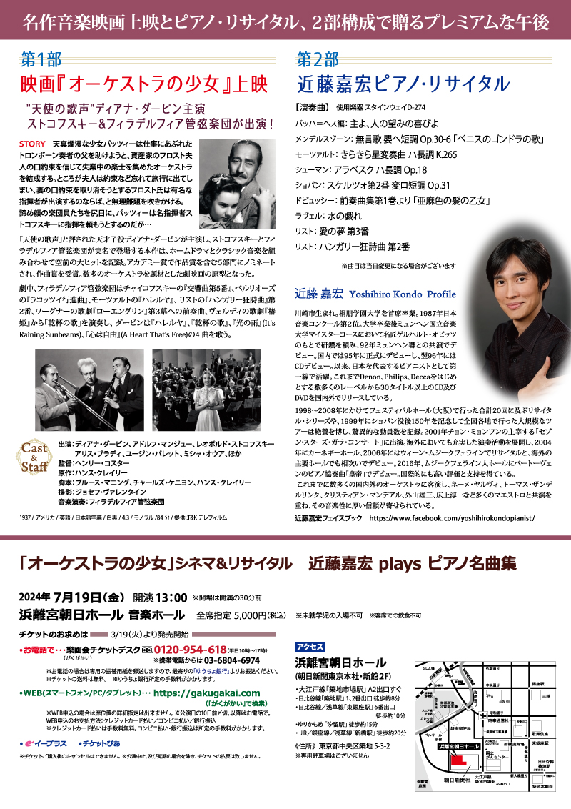 名作音楽映画の上映と、ピアニスト近藤嘉宏によるリサイタルの2部構成で贈るプレミアムイベント!