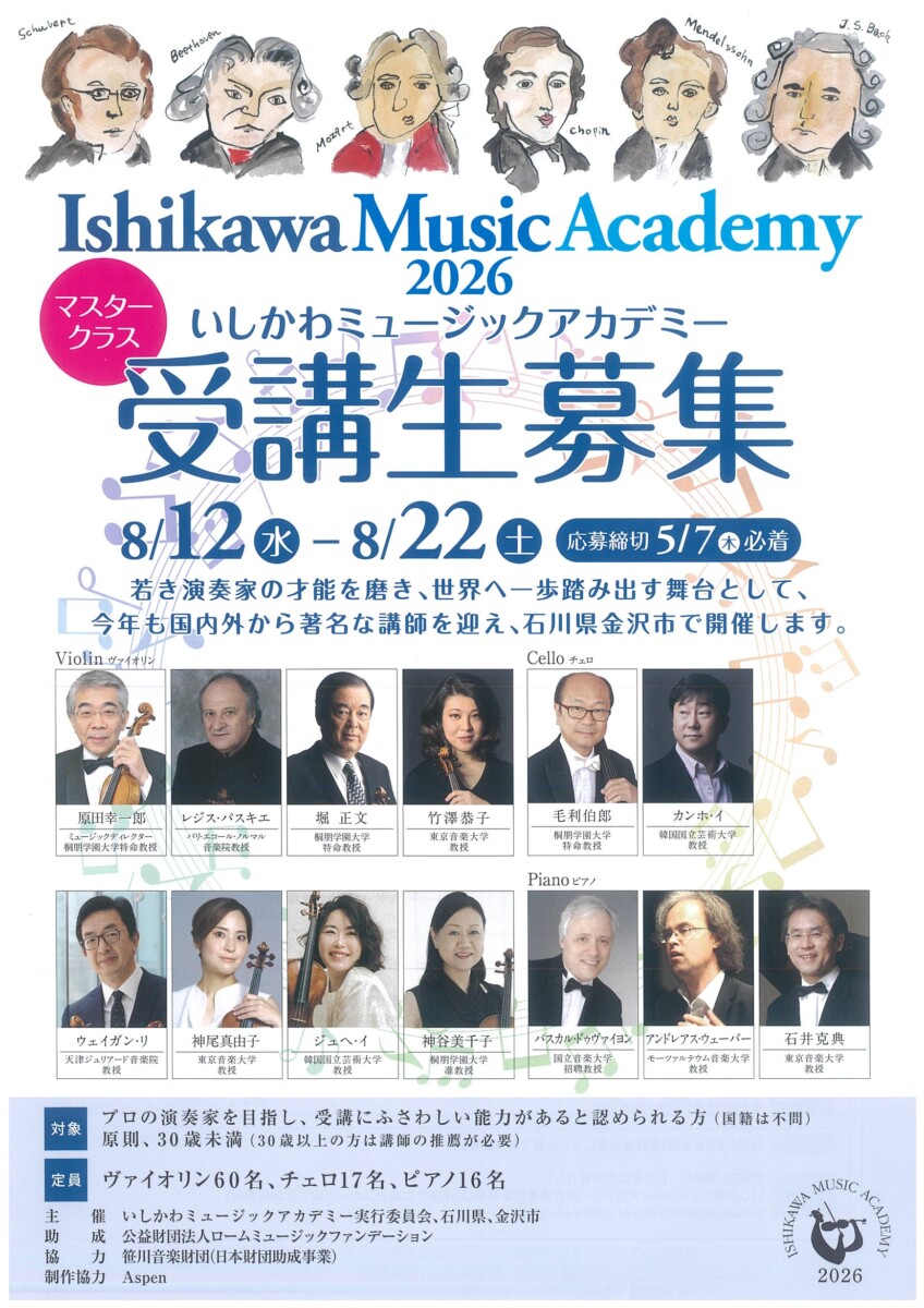 いしかわミュージックアカデミー実行委員会事務局 TEL 076-225-1372/東京事務所アスペン TEL 03-5467-0081